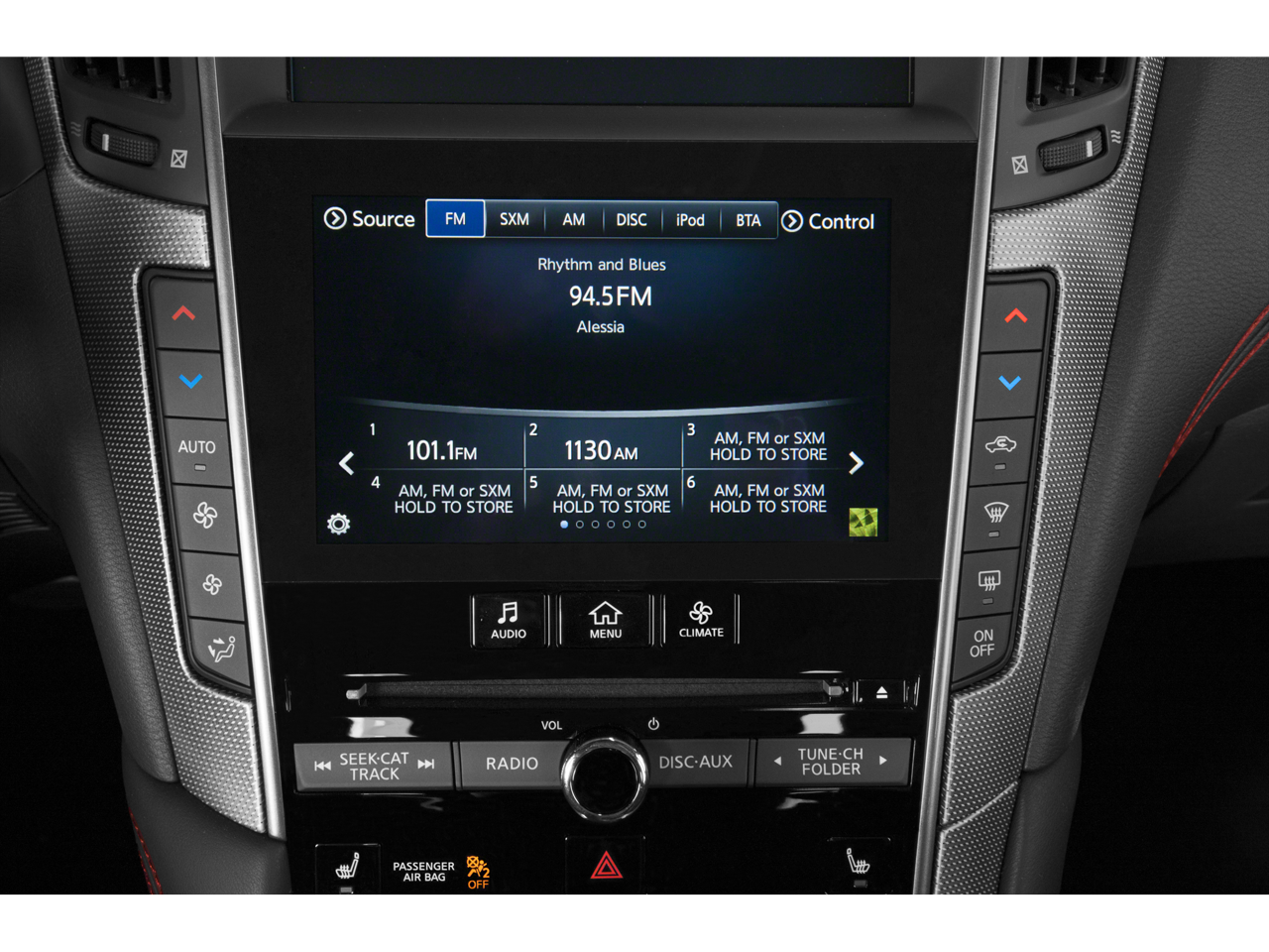 - Radio: INFINITI InTouch w/Navigation -inc: 16 speaker Bose Performance Series audio w/Bose Centerpoint simulated surround, navigation w/lane guidance, 3D building graphics, premium traffic and MapCare, voice recognition for navigation functions, including 1-shot voice destination entry, Apple CarPlay, Siri Eyes Free, Android Auto, Bluetooth® hands-free phone system w/text messaging assistant, voice recognition for audio, Bluetooth® and vehicle information, streaming audio via Bluetooth®, 2 illuminated USB connection ports (1 type A, 1 type C), auxiliary audio input, SiriusXM radio w/advanced audio features w/3-month complimentary trial, SiriusXM Traffic w/3 month complimentary trial access to real-time traffic information, SiriusXM Travel Link w/3 month complimentary trial access to weather, fuel prices, stock prices, sports scores, movie listings and parking and Wi-Fi hotspot