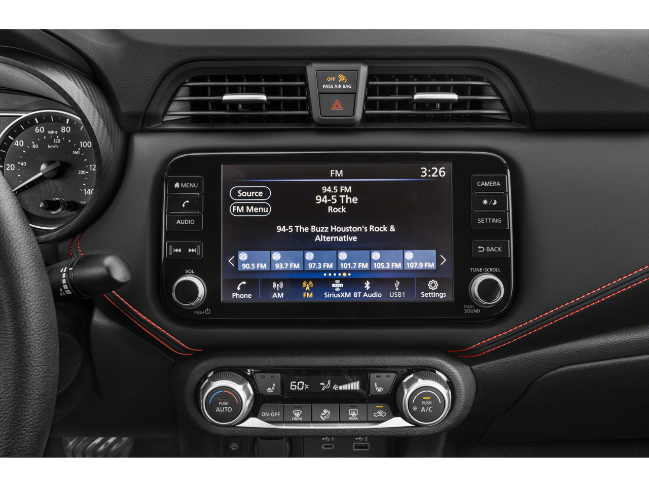 - Radio: AM/FM Audio System -inc: RDS, MP3, aux-in, 8" color touchscreen display, SiriusXM Radio, NissanConnect Services, Wi-Fi Hotspot, Bluetooth® hands-free phone system, streaming audio via Bluetooth®, interface for iPod and other compatible devices, hands-free text messaging assistant, Siri Eyes Free/Google Assistant voice recognition, 6 speakers, 12-volt DC power outlet and 3 USB ports (2-charge only)
